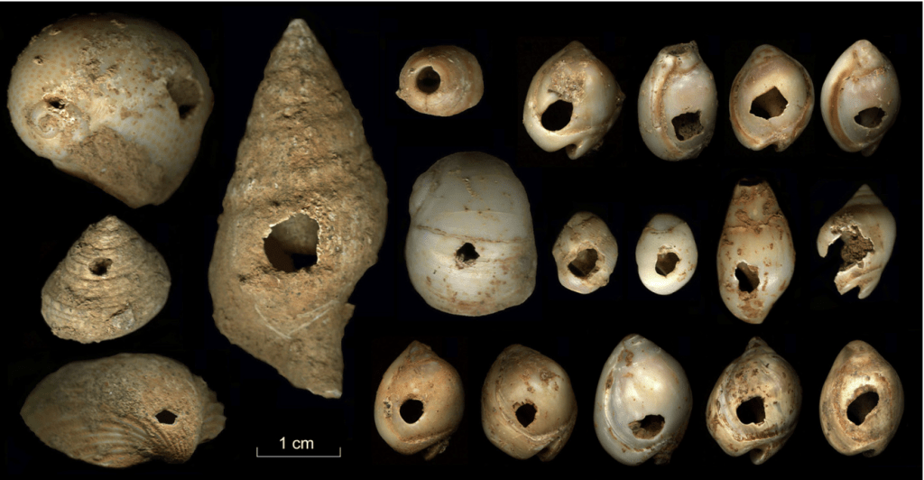 We would also have been familiar with the jewellery that people wore. From the beginning of the Upper Palaeolithic, we see small sea shells turning up at sites near the Mediterranean which have been carefully pierced through in order to be strung as beads. These holes do not occur naturally in the shells, they have been carefully made by people in order to convert a small and pretty shell into a bead. The specific shell which were in ‘fashion’ changed over the course of the Upper Palaeolithic, and towards the end of the Upper Palaeolithic we see an increase in the range of shellfish which get turned into beads, with even some larger shells being cut down and shaped into long and thin beads rather than using whole shells.