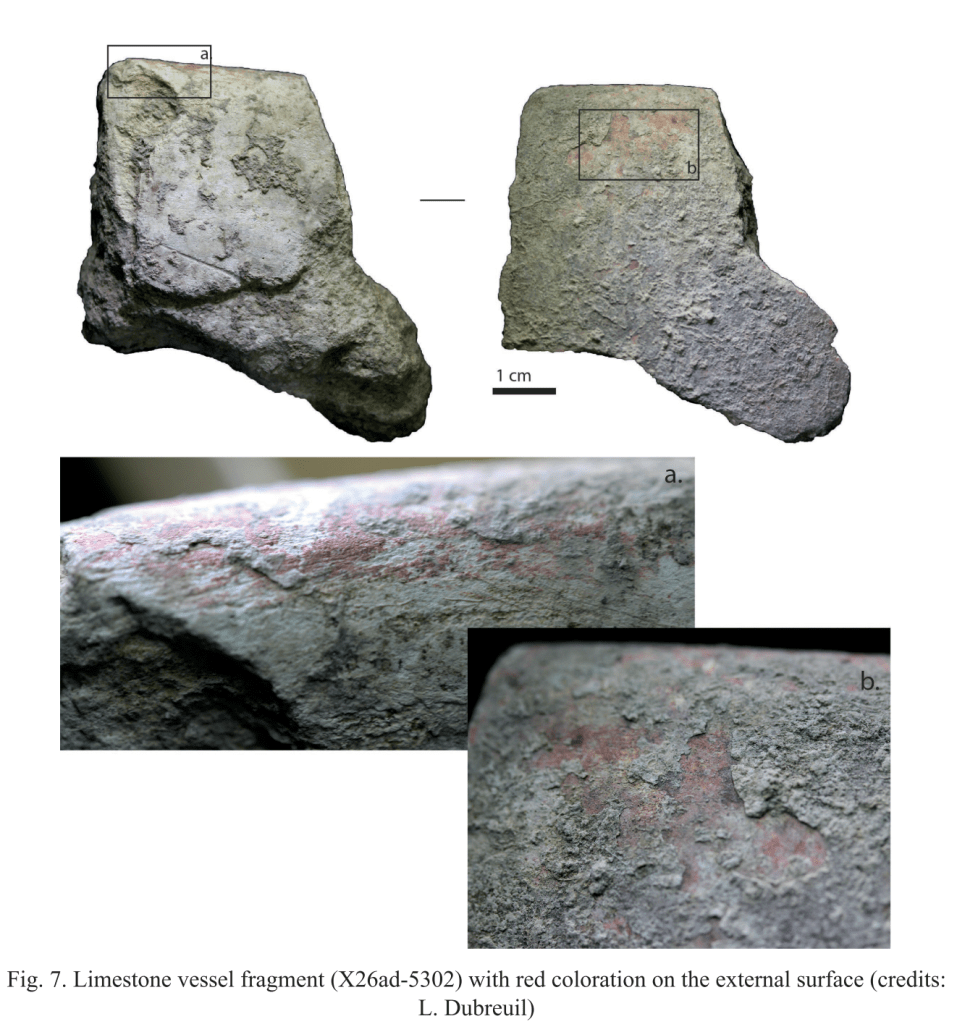 Fragments of a lmestone bowl from PPNC Beisamoun. Red painted decoration can be seen along the rim of the bowl. Image from Bocquentin et al. 2020.