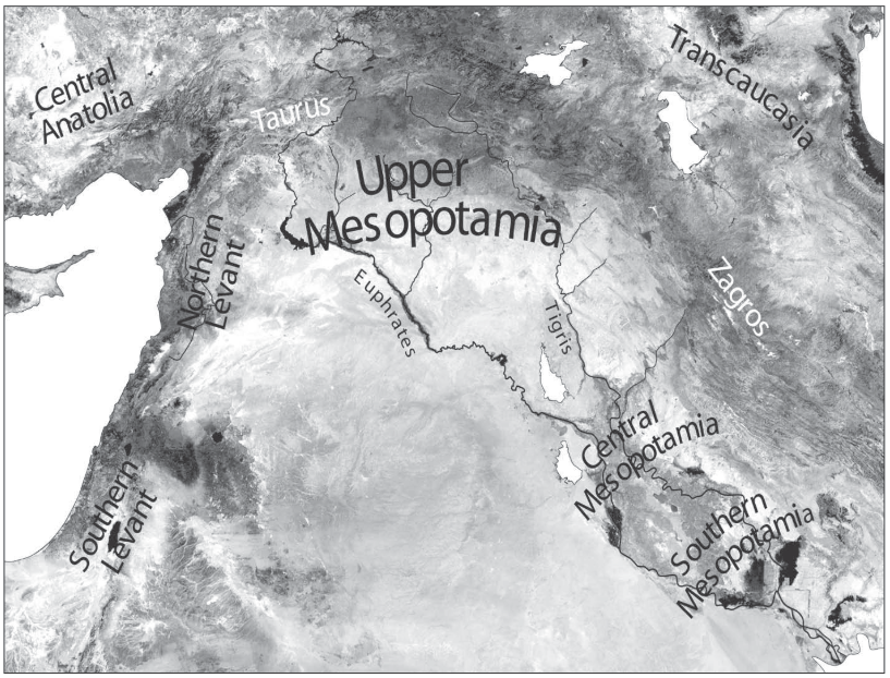 Map of Mesopotamia showing the northern/upper, central and southern/lower parts of the region as well as nearby regions of the Near East. Image from Bernbeck & Nieuwenhuyse 2013.