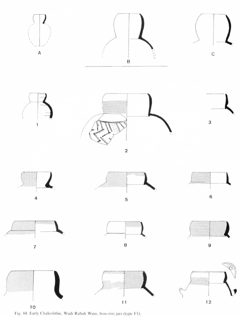 Pottery from the Wadi Rabah has a lot in common with pottery from the earlier Yarmukian culture. It is handmade, which is not necessarily the case later in the Chalcolithic (copper stone age) period. Pottery may still also be slipped or not, burnished or not, and decorated with incised geometric shapes or painting (or neither). In the Wadi Rabah, painted decoration on pottery becomes more common than incised decoration. A fashion starts to appear in the Wadi Rabah for painting a red band around the rims of jars, which is something that will continue to be in fashion later in the Chalcolithic. We also see a new type of decoration on some of the pottery, with extra clay added to the outside of vessels and shaped into designs or even figures.